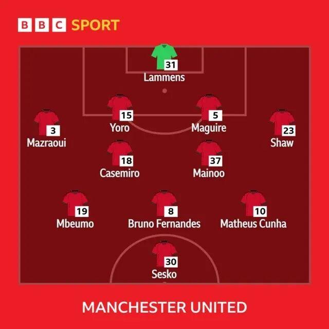 曼联有两次可能取得进球的机会,青训中场科比·梅诺禁区弧顶的远射被门将扑出;而库尼亚突破后射门造成门将脱手,姆贝莫补射空门却将球踢飞。