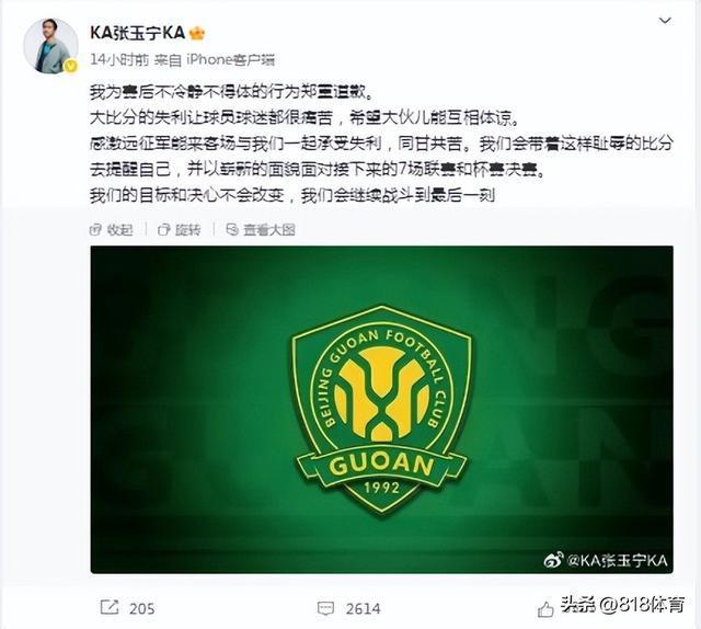 事后,张玉宁在社交媒体上发文道歉,“我为赛后不冷静不得体的行为郑重道歉。